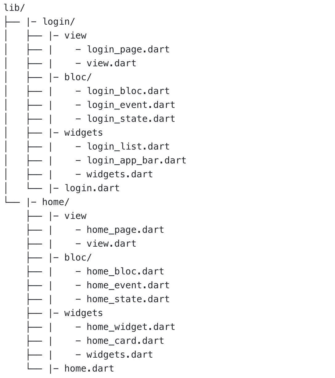 Your test folder should mirror your lib/ folder. This makes it easy to see which parts of the code have been tested and which have not. The only difference between test/ and lib/ is that each file will have _test.dart appended to it.