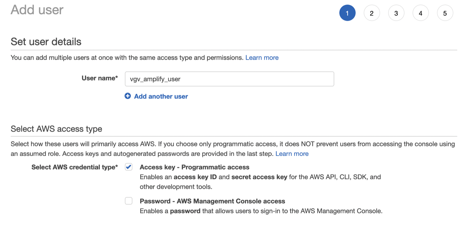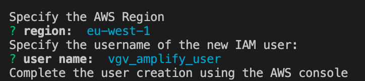 - Set the username (in this case I added vgv_amplify_user but you can use your own username).