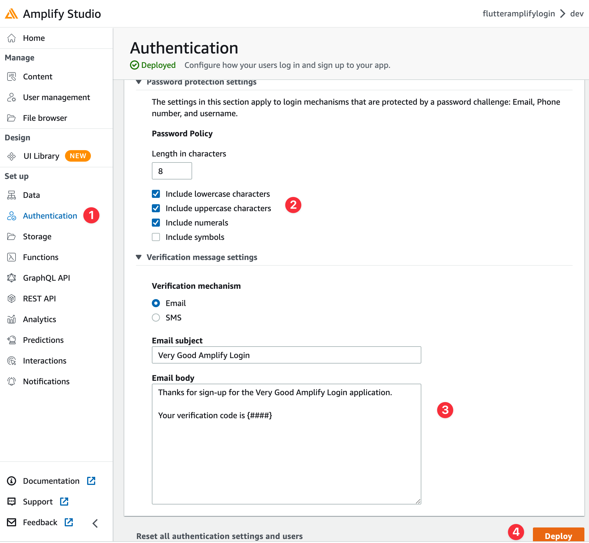 Now we’re going to configure the authentication settings in Amplify Studio. Here we’ll be able to see password protection settings and change the body of the email that is sent to the user when the user signs up.