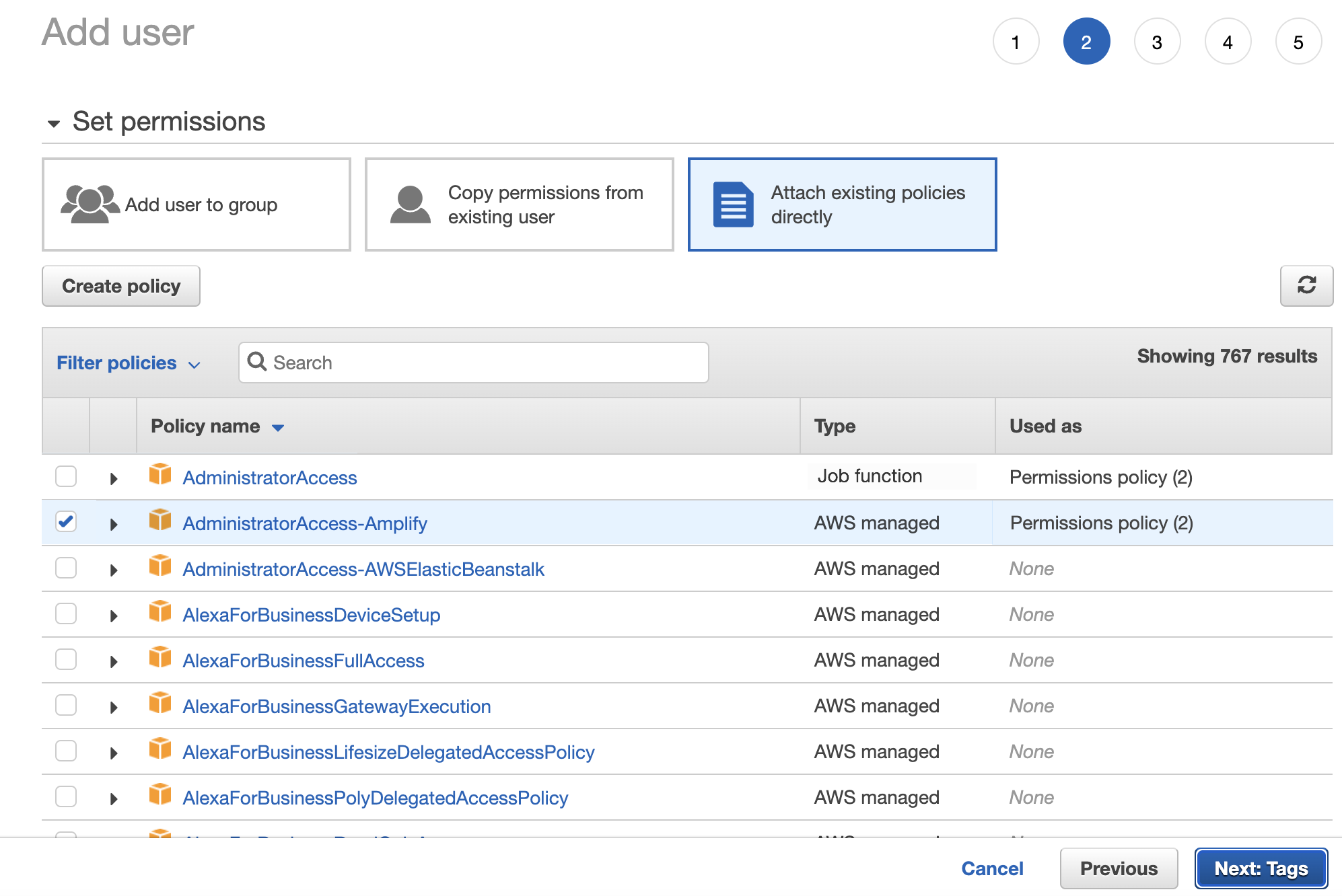 - Select AdministratorAccess-Amplify for this user.