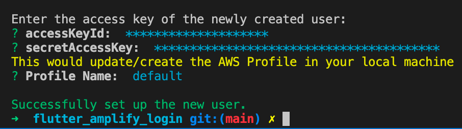 3. Go back to the terminal and set the keys that we saw in the last section. Set the Profile name as default.