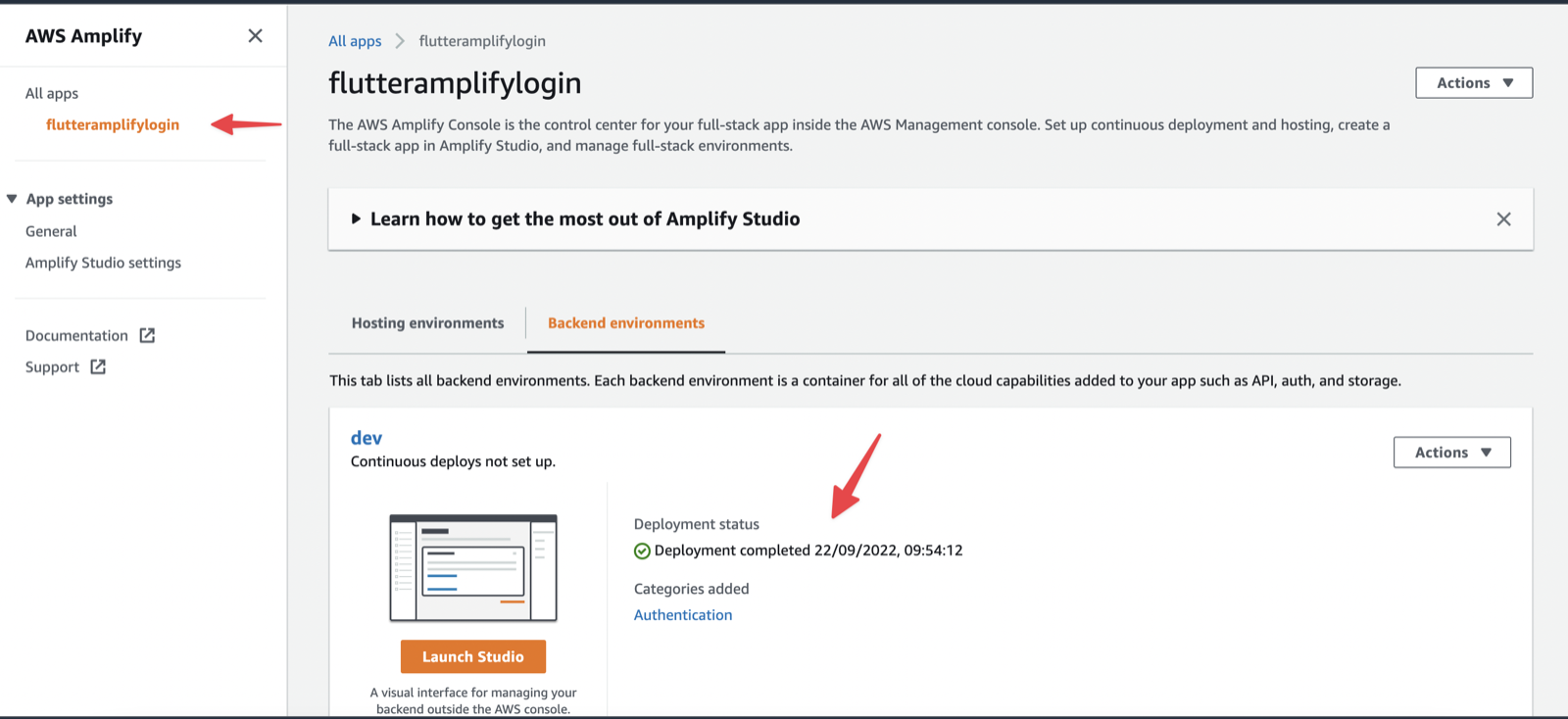 - Go to Amplify Studio and select the project that you created.