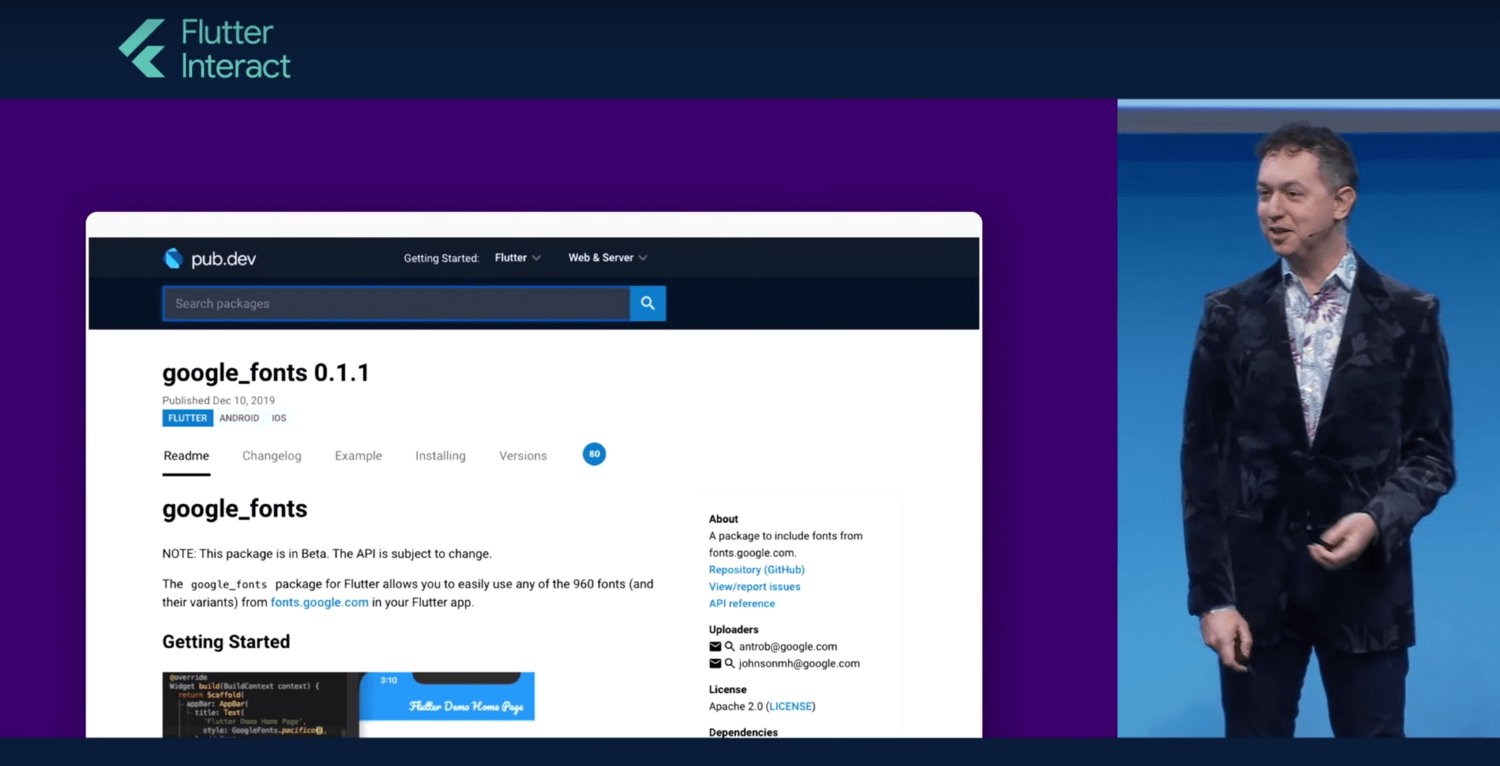 The Flutter team also announced a Google Fonts plugin for flutter that allows you to use your preferred font directly in dart code. For many, this means the end of importing font files and adding them to your pubspec.yaml. Yet another breakthrough to increase efficiency and productivity.