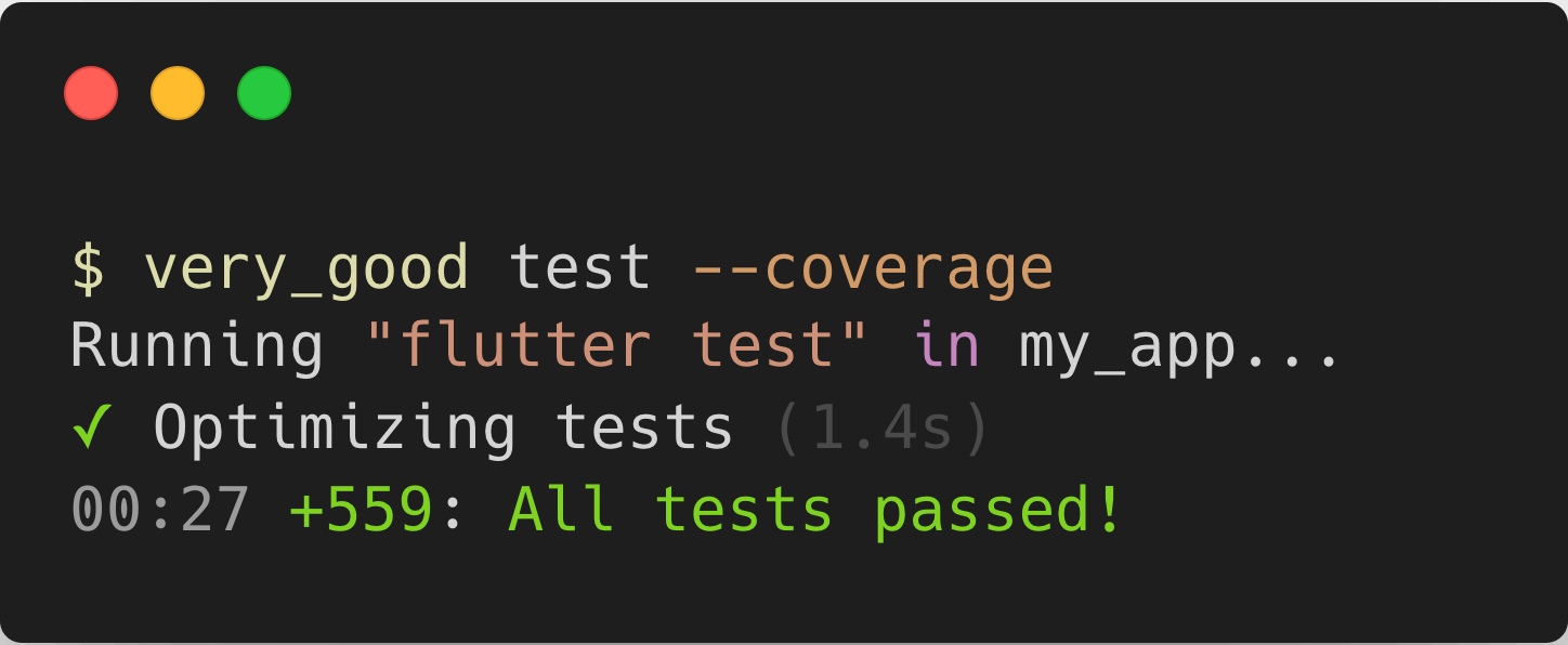 Very Good CLI v0.6.0 now features a new test command that provides additional functionality on top of the existing command line tooling for dart test and flutter test.