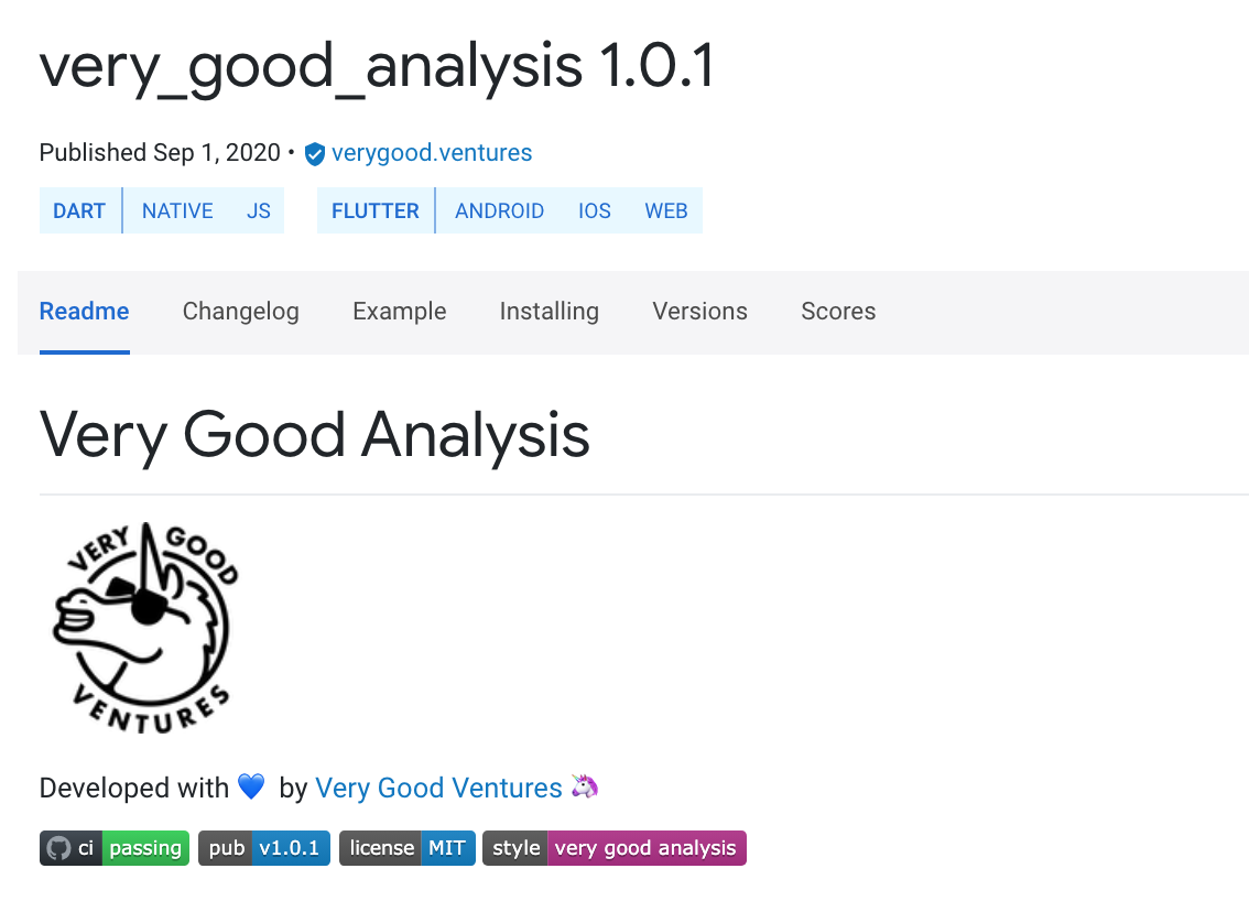 If you use Very Good Analysis in your project, you can also unlock the Very Good Analysis badge on GitHub. The documentation contains instructions for how to add the badge to your README.md.