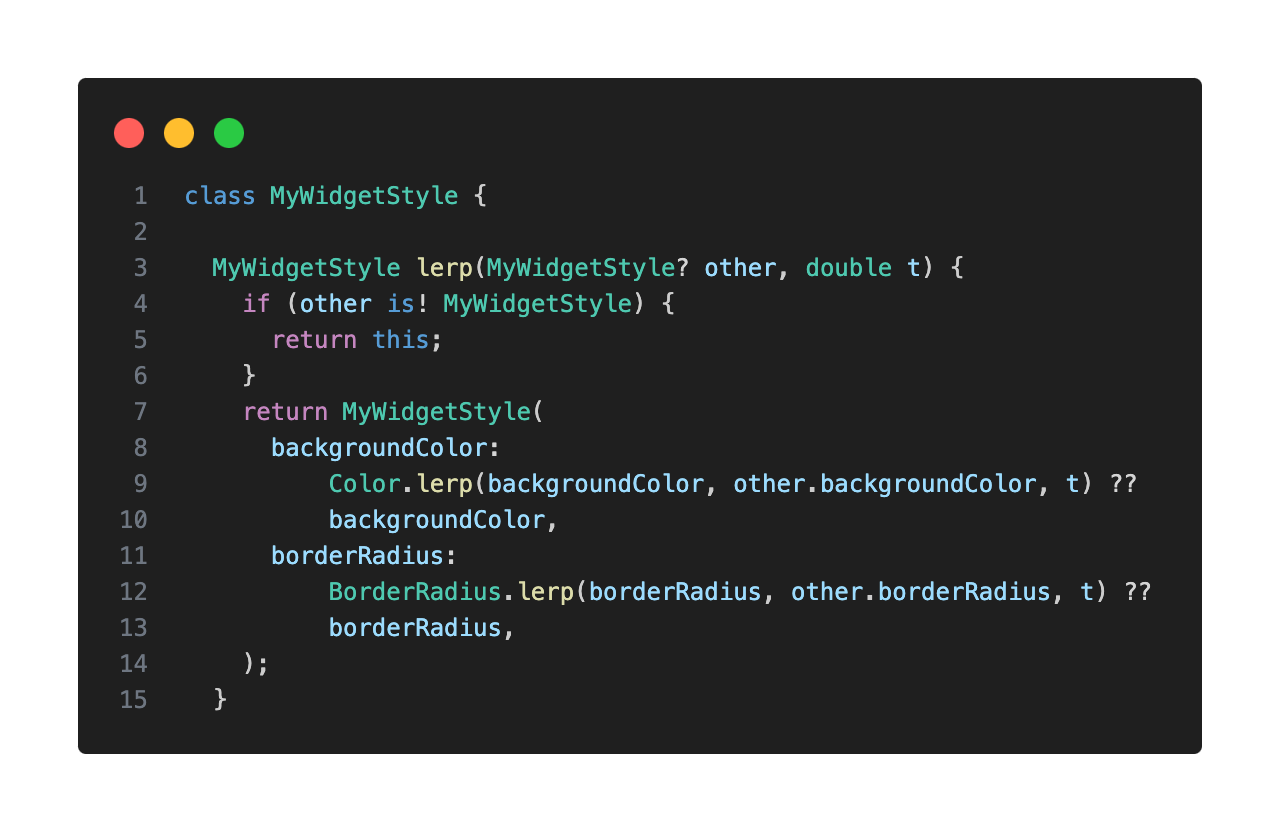 Also override lerp(), which is used to interpolate between two style instances—useful for animated theme transitions like switching between light and dark mode. In Flutter, many properties beyond colors can be “lerped,” such as shapes, decorations, and text styles. This method is vital for providing a polished user experience during theme transitions, for example, when animating between light and dark mode.