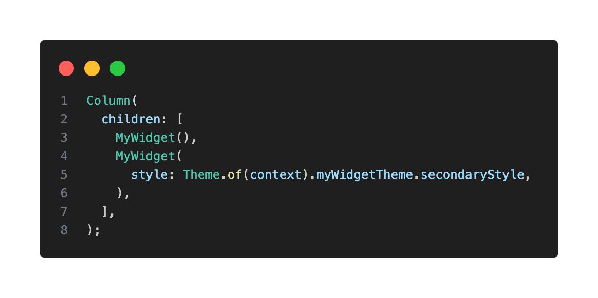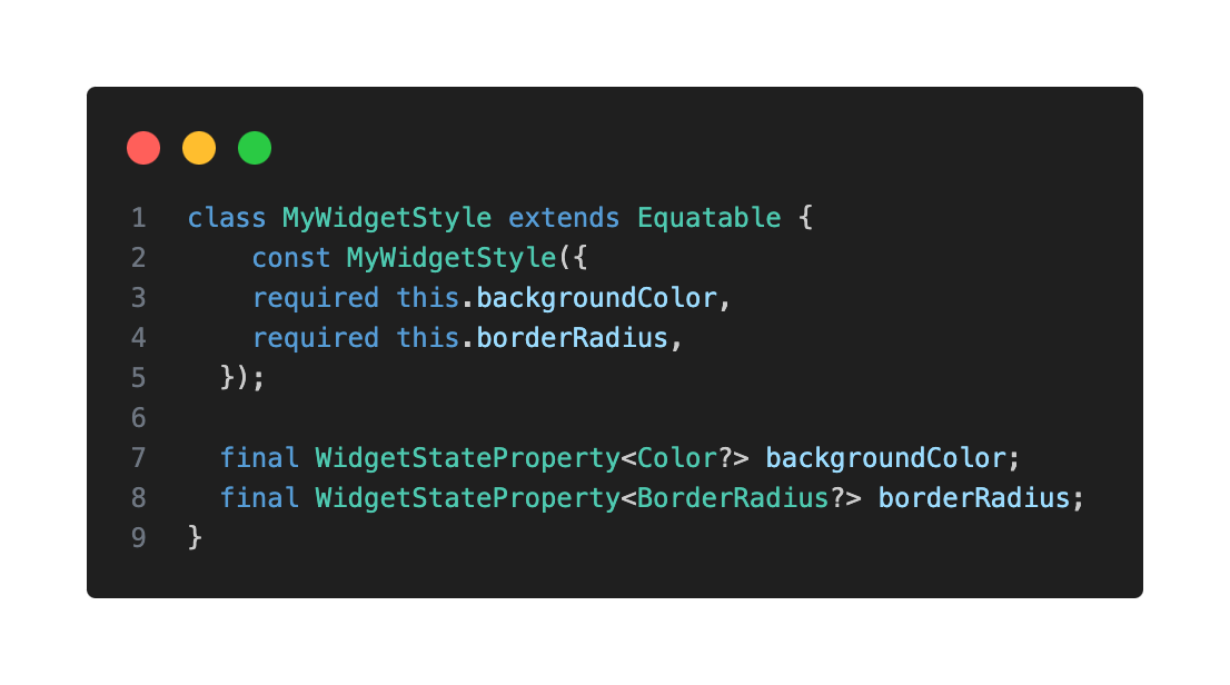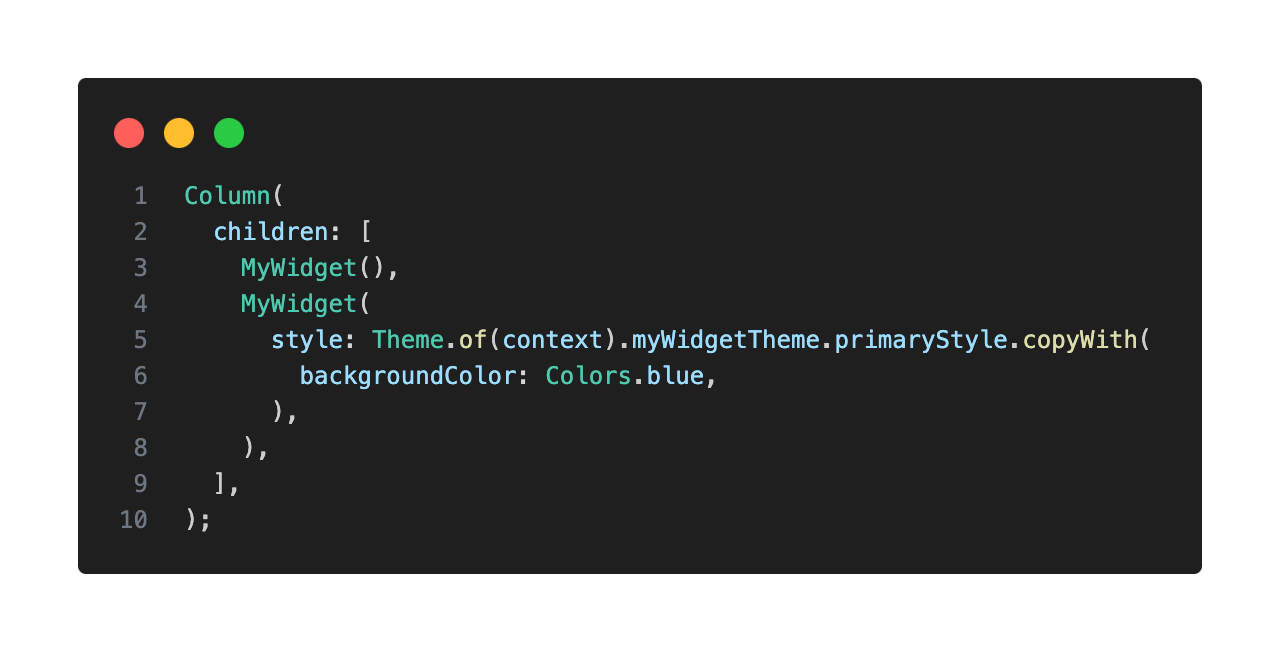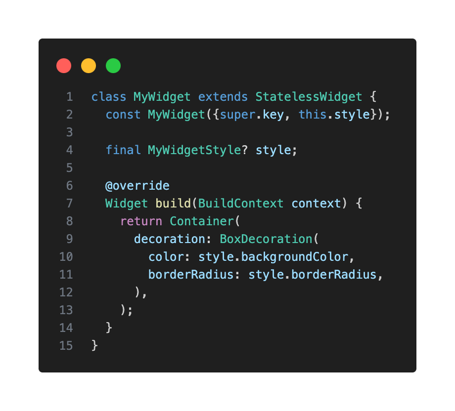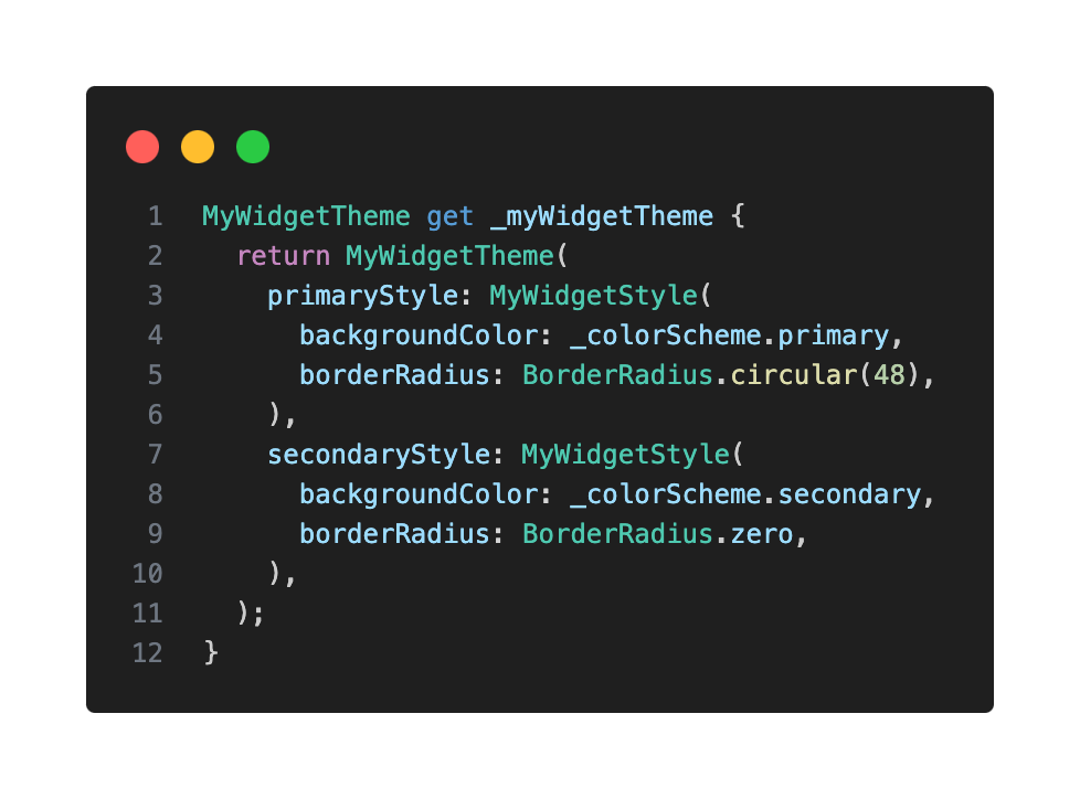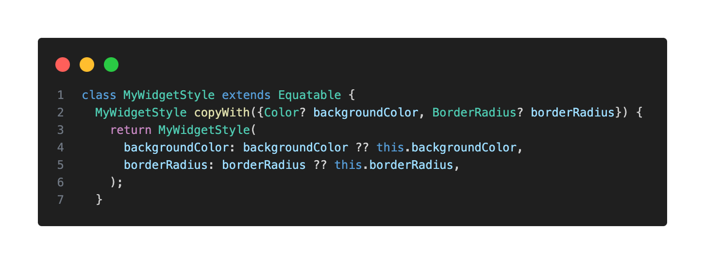 I also recommend defining a copyWith() method in your MyWidgetStyle class, as it’s incredibly useful. It allows you to create a copy of a particular style while changing only a few properties, without redefining the entire style. This is handy for situations where a style is mostly the same but needs slight modifications.