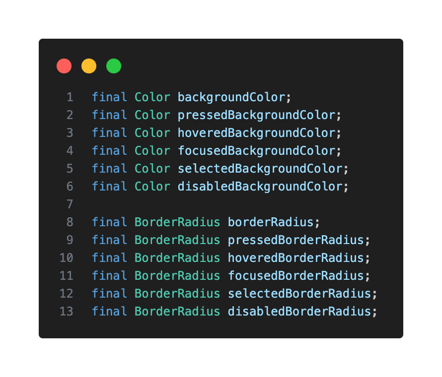 Instead, when a custom widget requires distinct visual variants, I recommend encapsulating style-related properties in a dedicated class. This clearly separates the concerns between the widget’s dynamic style (themable appearance) and its other non-stylistic members.