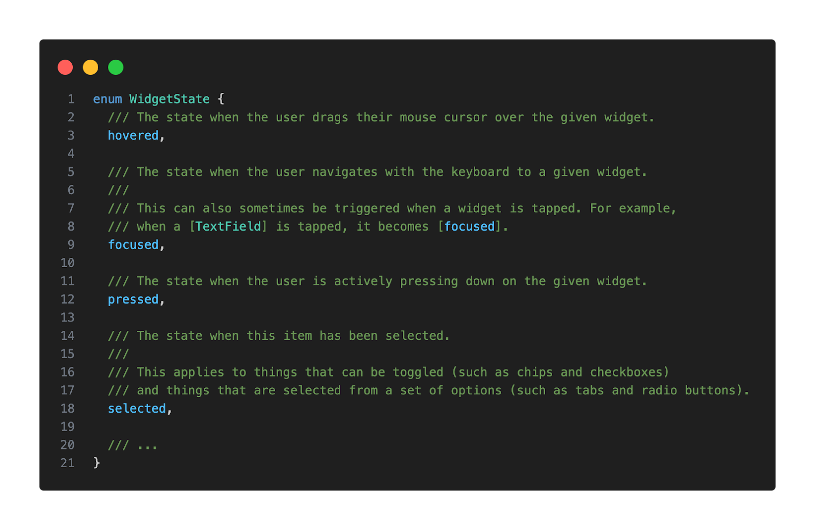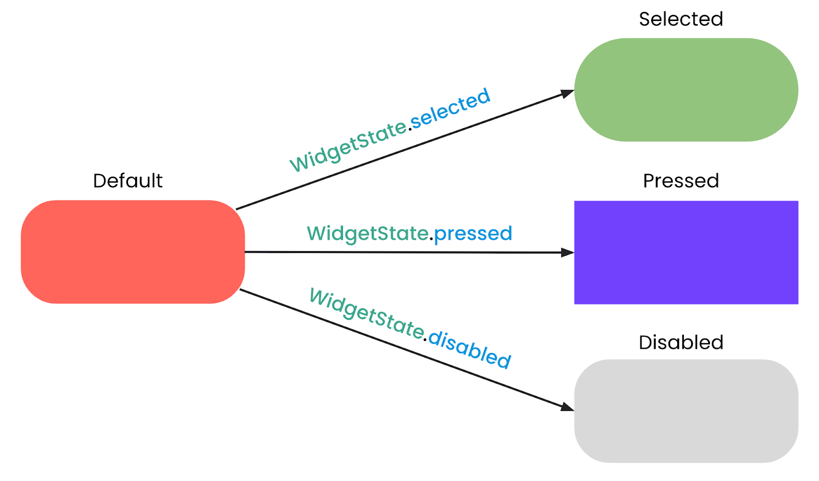 Before diving into that solution, let’s understand what Flutter refers to as WidgetStates. A WidgetState is an interactive state recognized by the Material Design Library (but not limited to it) that includes states such as pressed, hovered, focused, or disabled.