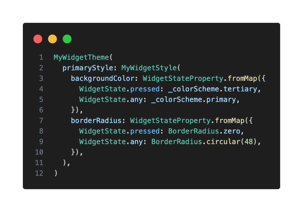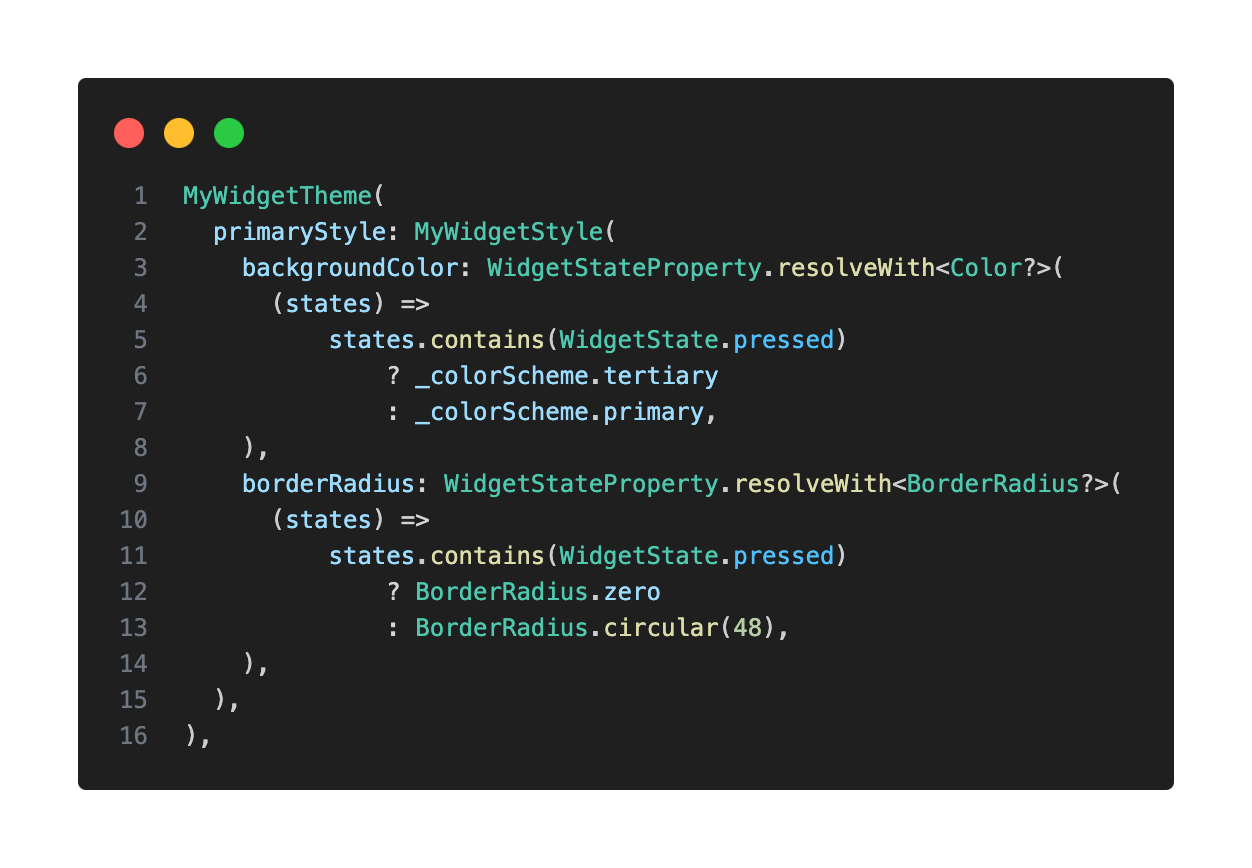 In your MyWidgetTheme, you’ll define how each style property resolves based on the provided WidgetStates set using the resolveWith method.