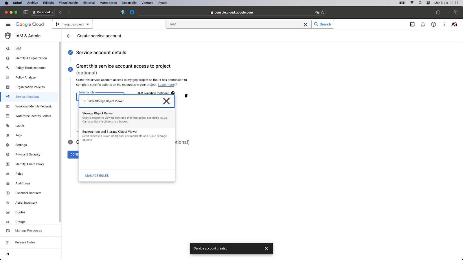 - After its initial configuration where you set the name and a description (the ID will be populated automatically but you can change it), Google Cloud will ask for the role you want to assign to that service account. Here we will use a predefined role offered by Google called “Storage Object Viewer” that has the storage.objects.get permission we need.