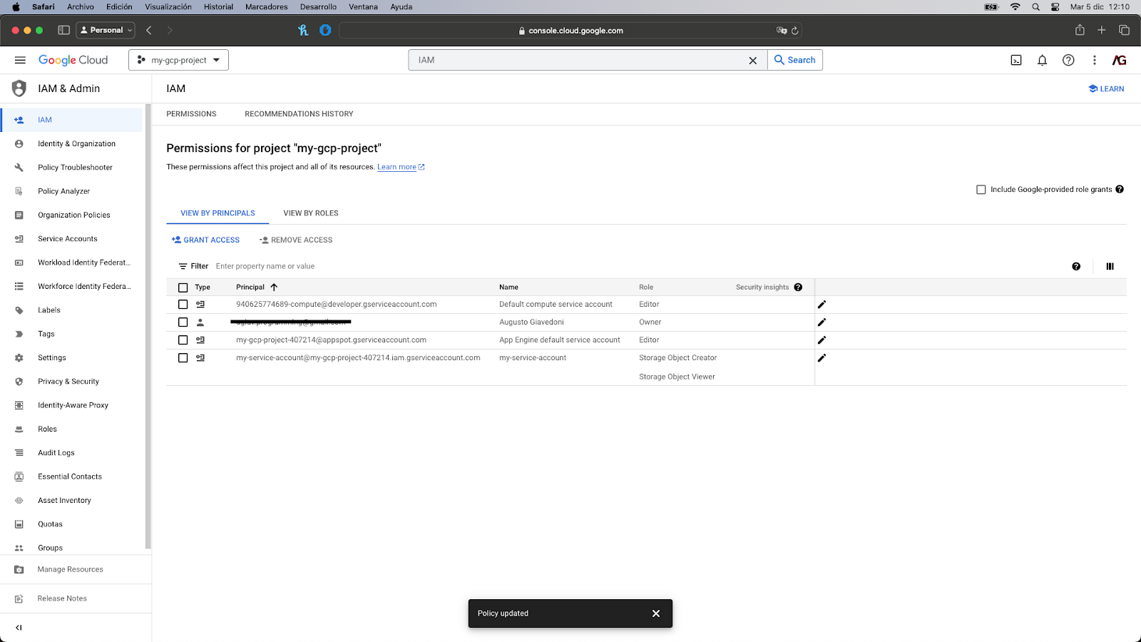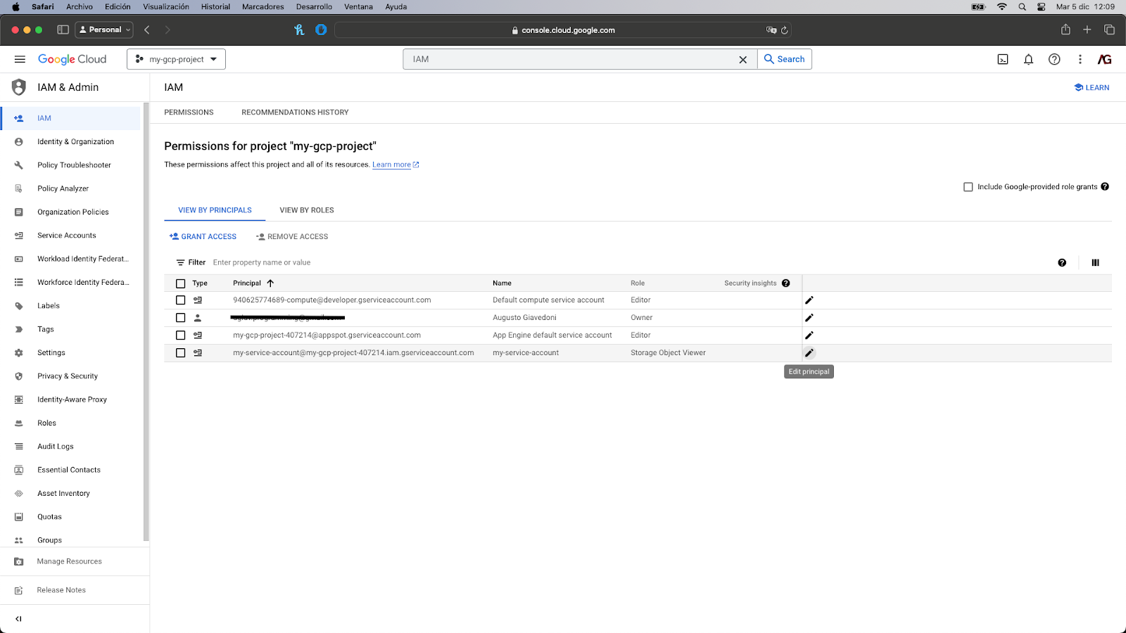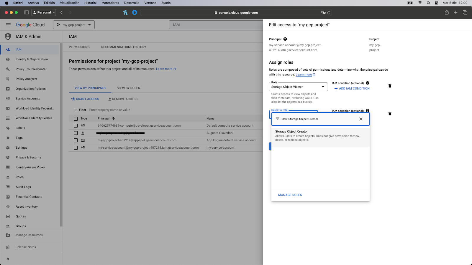 Now let’s suppose you need to implement a new requirement: The Cloud Function has to write some results after reading the file. The good news is that you don’t have to create a new service account. Google Cloud offers the possibility to edit service accounts and add or remove permissions as needed.