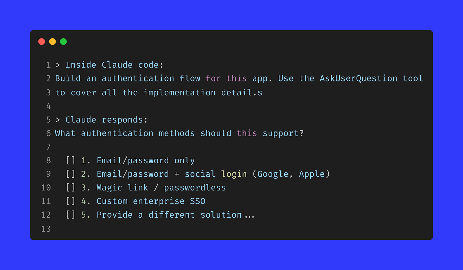 You pick an option. Claude asks another question. And another. By the time it writes code, every major decision has been explicitly made by you.