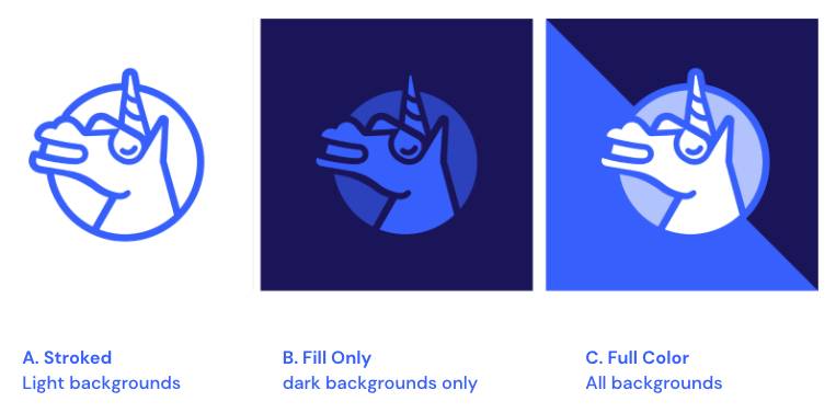 The new unicorn mark evokes the same positive and playful feeling , but is simpler and better constructed as an asset. We’ve significantly reduced the visual complexity which helps the logo to maintain fidelity at smaller resolutions, which is important on digital platforms. Additionally, its tighter composition allows us to modify it in ways that aren’t possible with the old logo. For instance, we can add background colors or textures to the circle without breaking the form.