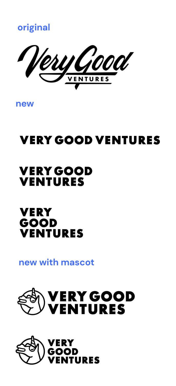 The original Very Good Ventures wordmark was a fun hand lettering element, but it is something that we’ve had a hard time using in practice. It didn’t really pair in an obvious way with the unicorn mark, and we needed a better solution.
