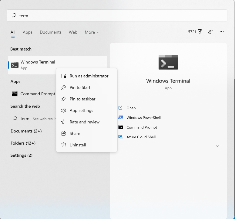 While the Mac has Homebrew, the Windows equivalent is Chocolatey. It’s not technically required to get Flutter running on Windows, but it will make things much easier. You can follow the install instructions on their site. One thing to note is that you need to start the Terminal in “administrative mode”. Do this by right clicking on Windows Terminal in the Start menu and select “Run as Administrator.”