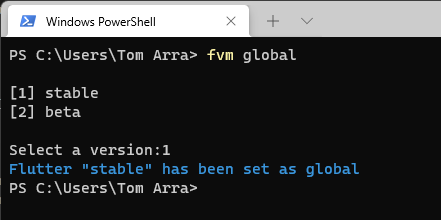 When setting the global version of Flutter to use, you will be shown the list of all Flutter versions you have installed so far. In this case we want to choose stable. By default, fvm is installed in your user directory. Once it is installed you can easily proxy flutter and dart commands through fvm.