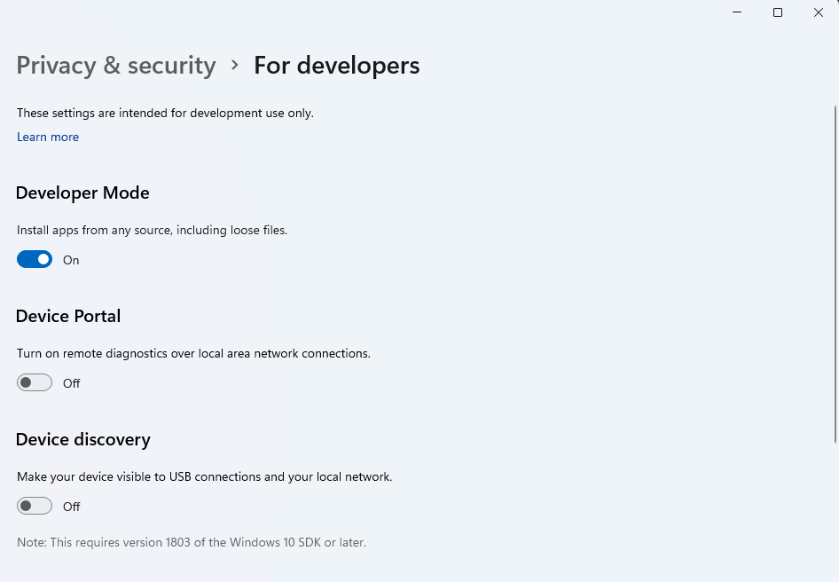 If your ‘re already in the Terminal, you can quickly jump to this by entering start ms-settings:developers. Otherwise, you can also get to it via the Settings app under Privacy & Security, and then For Developers. Go ahead and flip the “Developer Mode” switch to on.