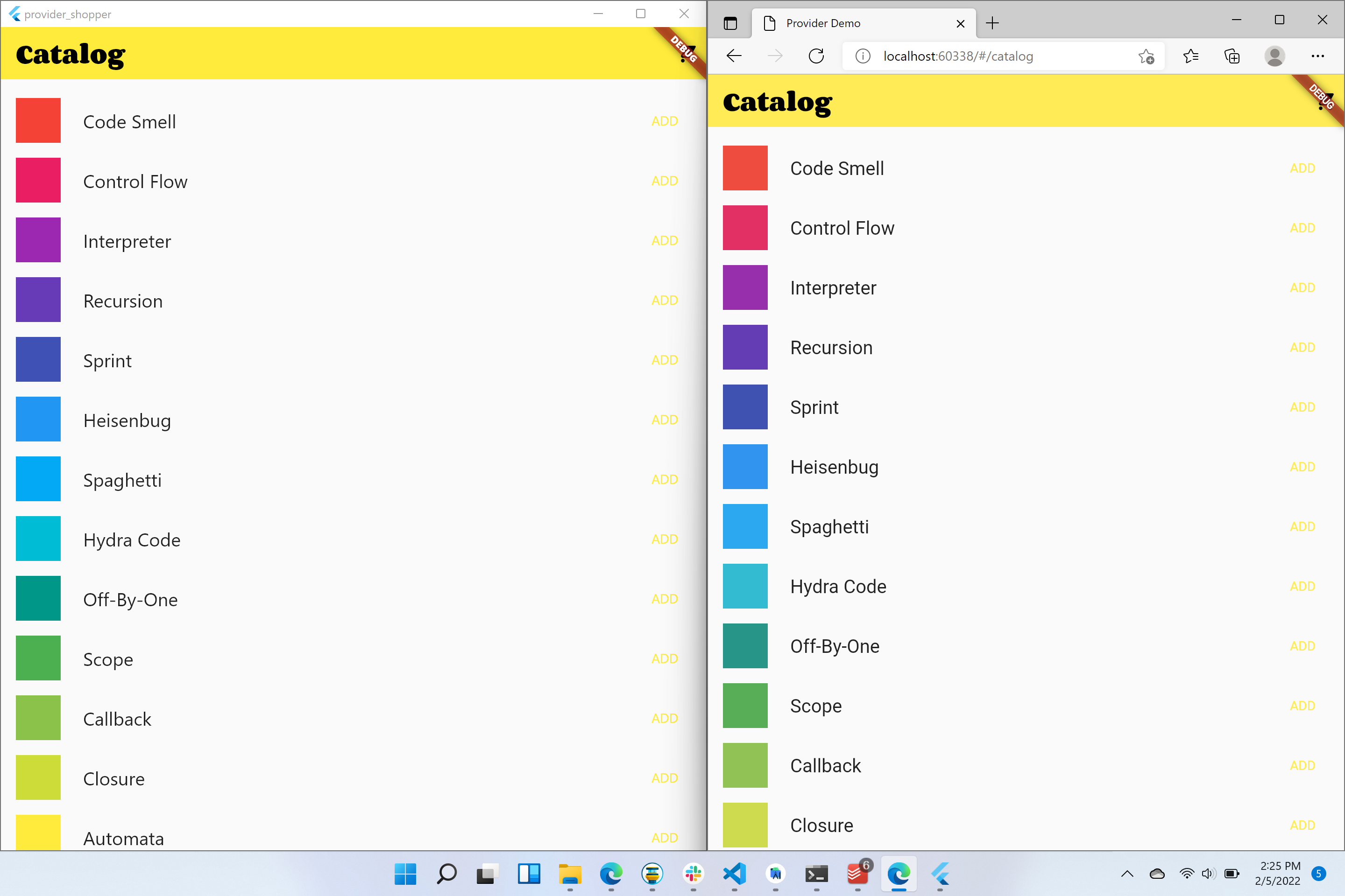 In order to demonstrate this we can easily take a Flutter project from the Flutter Gallery, execute the create command to add the Windows support, and then run the app side by side with another platform like web via Edge.