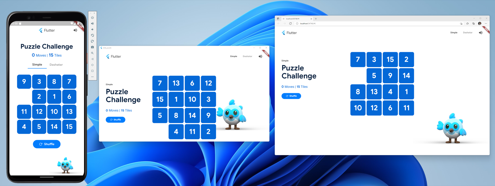 If you take the extra time to setup Android Studio, we can even get three platforms all running at the same time. Simply updating a few packages allows us to get the slide_puzzle running in Android, Windows, and Web via Edge.