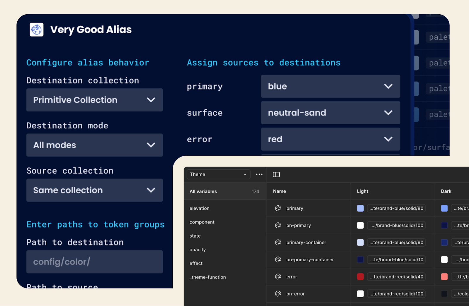 Often in design systems, there are raw color values related to a brand (e.g., blue or red), and separate semantic roles (e.g., primary or secondary) that all appear in design tokens. For complex products, making sure the brand color and its variants stay synced and updated across all of their semantic roles can be tedious. This plugin bulk-assigns variables to their semantic usage in seconds, providing a quick way to configure a theme. It replaces hundreds of clicks down to a few for each color. It’s a game changer. Using Cursor, I even built a variant that re-aliases based on values instead of names in about an hour.