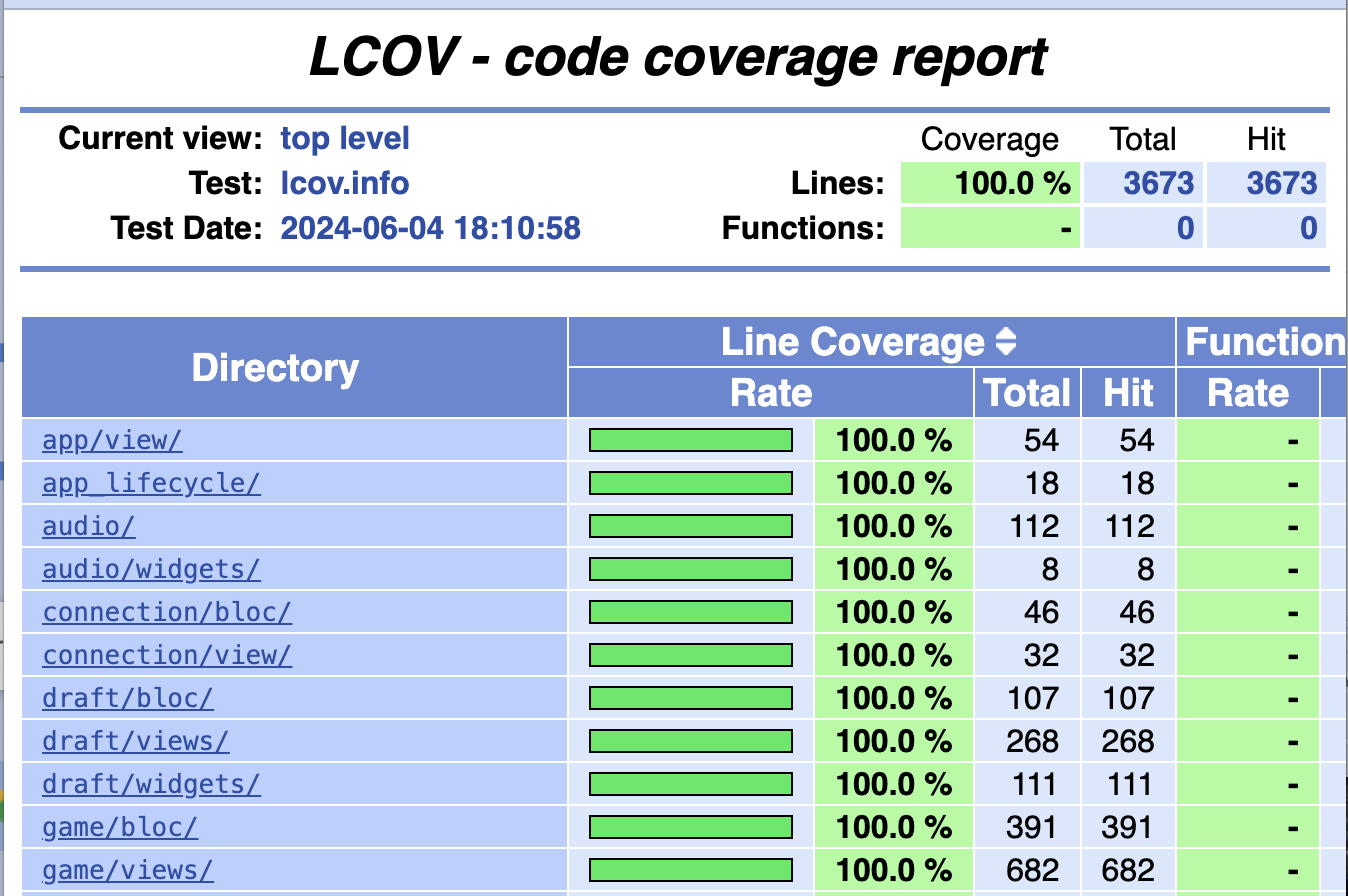When assessing code we always check the code coverage using automated tooling. Our Flutter projects use very_good test —coverage, our Android projects use JUnit, and our web projects use Jest. At VGV, we run this on the main application and all local packages within the project. In Flutter, you’ll get a coverage report printout like the one below that I ran on the Google IO_Flip repository: