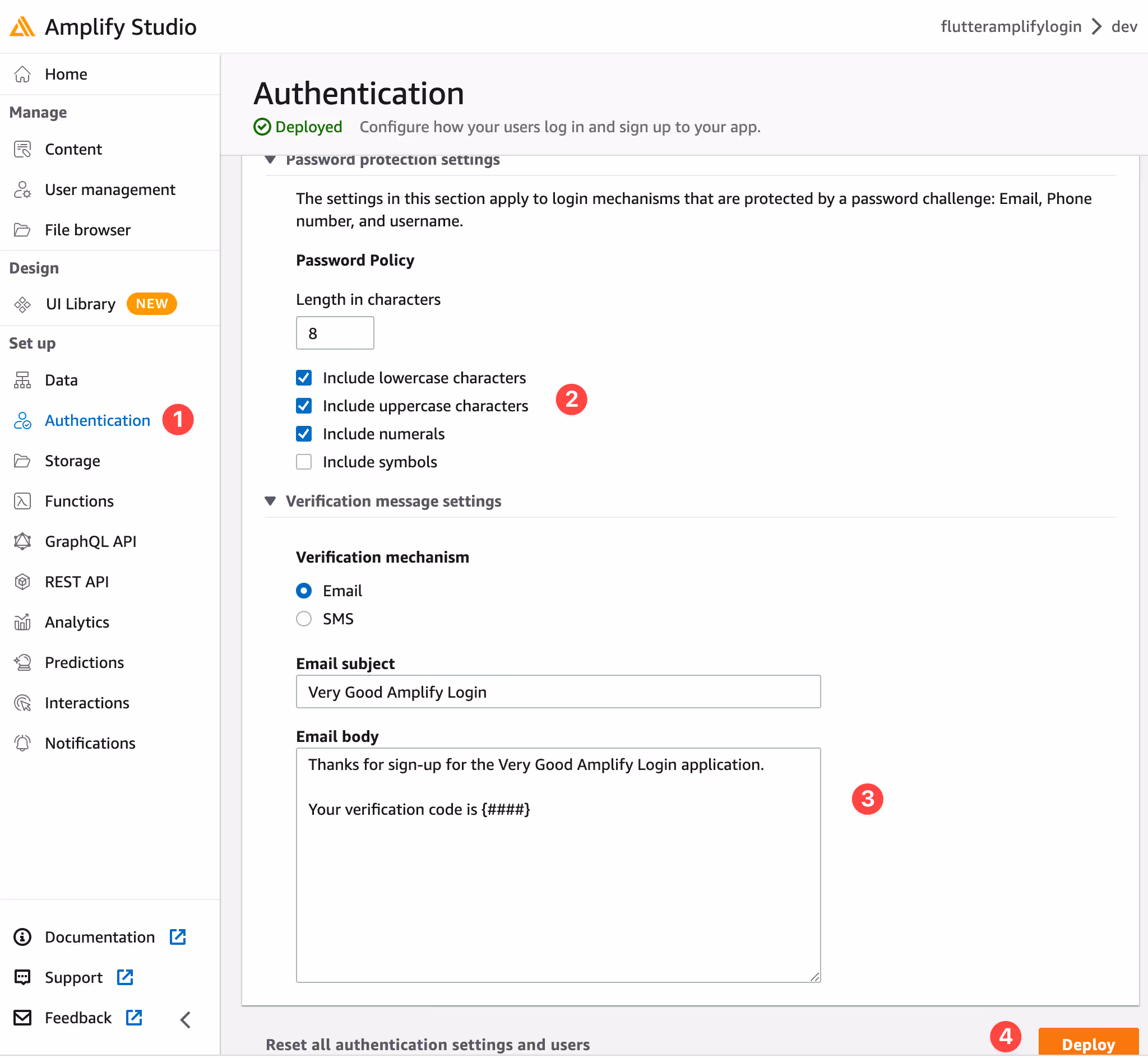 Now we're going to configure the authentication settings in Amplify Studio. Here we'll be able to see password protection settings and change the body of the email that is sent to the user when the user signs up.