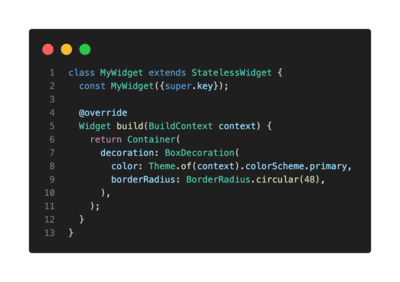 For a simple custom widget with minimal styling, you can easily style it directly inline. You might get colors from the ColorScheme and set a specific borderRadius for the widget. This approach works well when your widget has only one style and its styling is minimal.