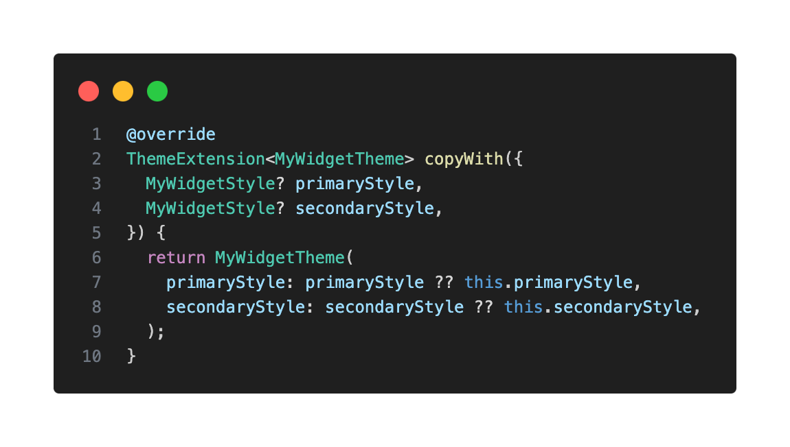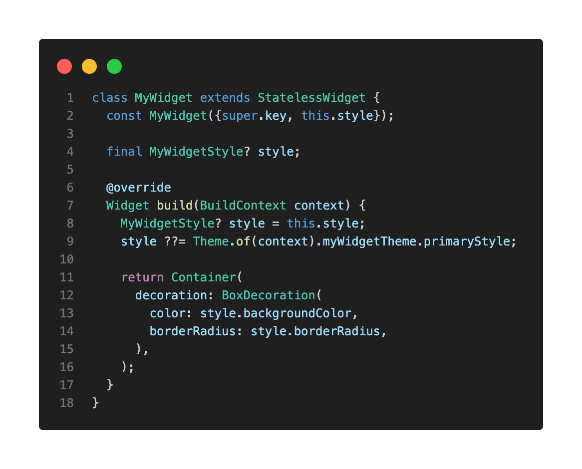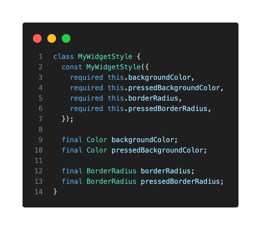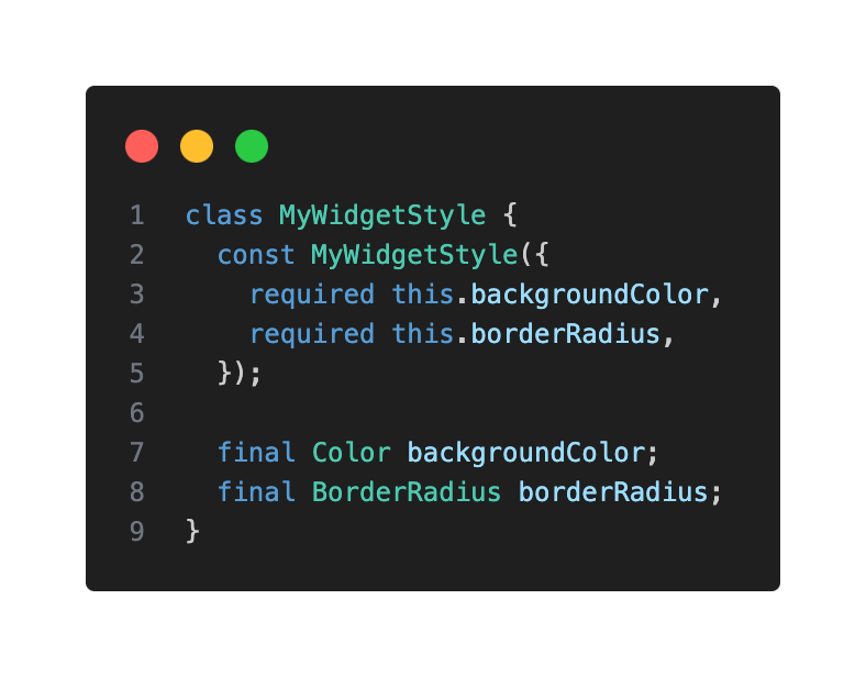 I also recommend defining a copyWith() method in your MyWidgetStyle class, as it’s incredibly useful. It allows you to create a copy of a particular style while changing only a few properties, without redefining the entire style. This is handy for situations where a style is mostly the same but needs slight modifications.