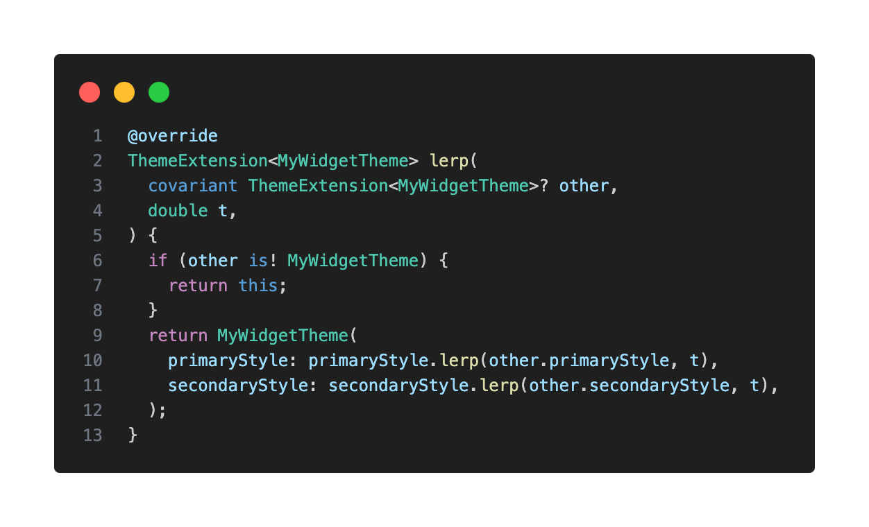 Also override lerp(), which is used to interpolate between two style instances—useful for animated theme transitions like switching between light and dark mode. In Flutter, many properties beyond colors can be “lerped,” such as shapes, decorations, and text styles. This method is vital for providing a polished user experience during theme transitions, for example, when animating between light and dark mode.