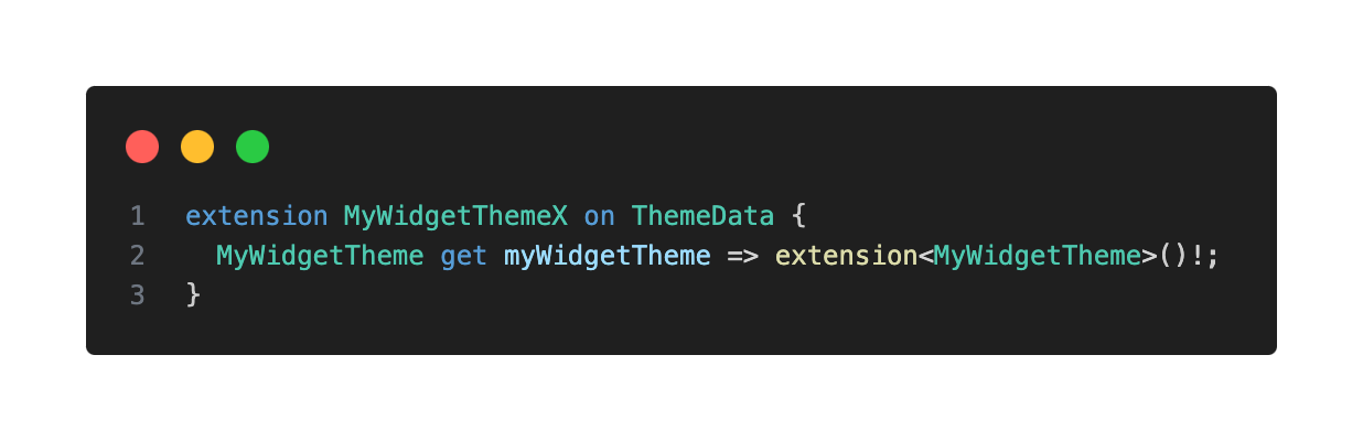 To access your custom theme extension within your widgets, it’s good practice to create an extension on ThemeData. This allows you to call your custom theme extensions as if they were any component theme and also handles null checks in a single place.