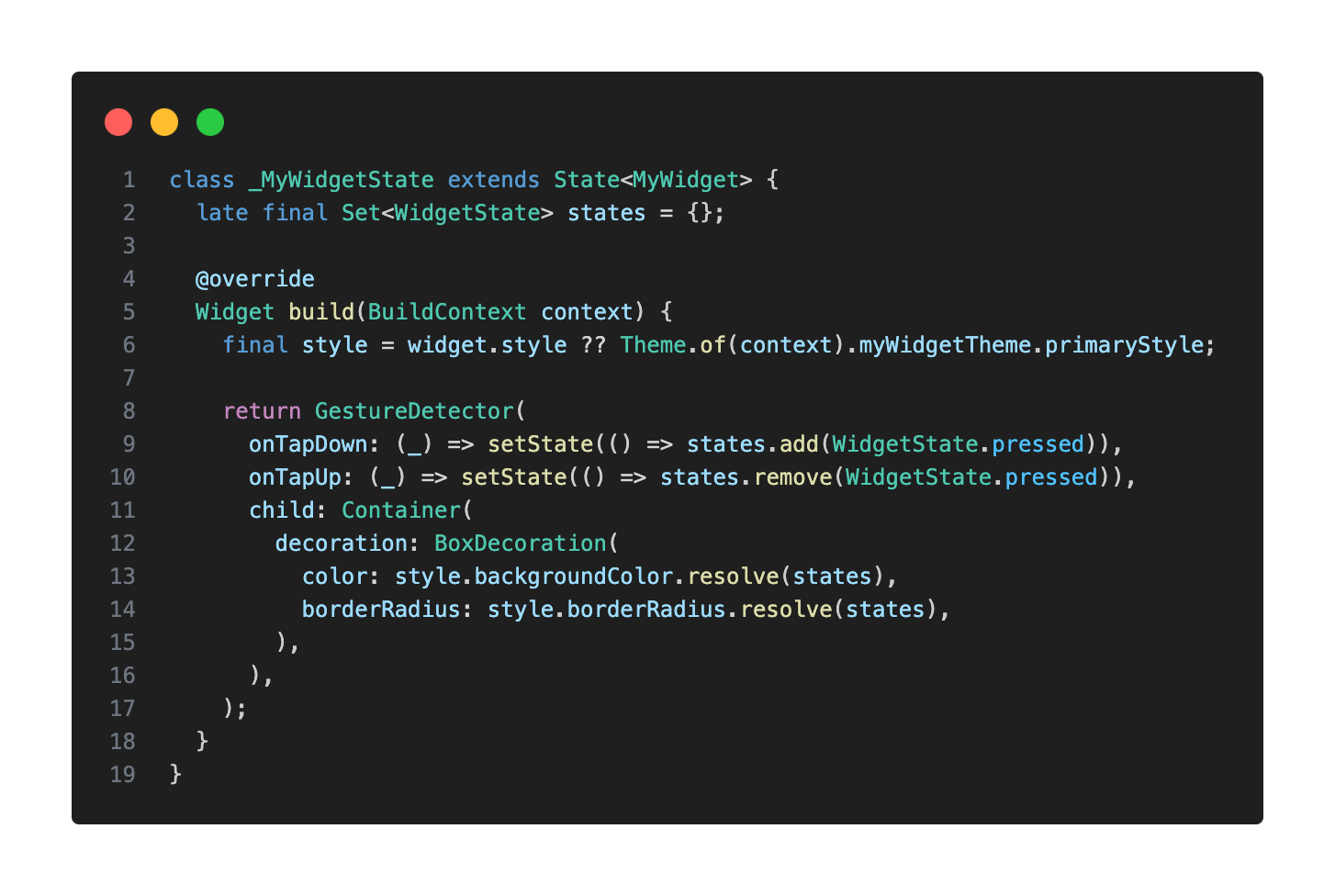 In your MyWidgetTheme, you’ll define how each style property resolves based on the provided WidgetStates set using the resolveWith method.