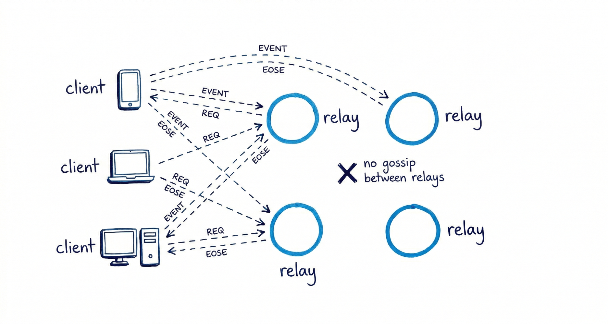 A critical design choice: relays generally do not talk to each other. The protocol defines no gossip layer, no consensus mechanism, no peer-to-peer relay mesh. Some relay implementations do sync with each other, but this is not common and not something clients can rely on. In practice, if you publish an event to Relay A, you should assume Relay B does not have it unless a client also sends it there.