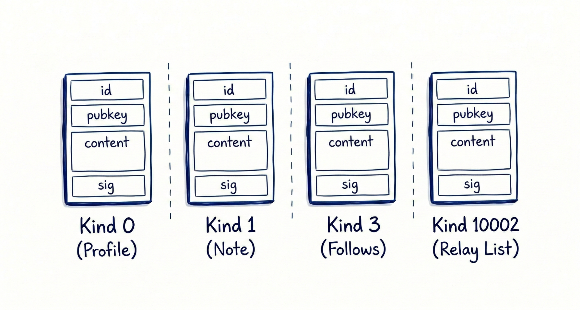 That is the entire data model. A profile update, a text post, a follow list, a direct message, and a video event all share this exact structure. What differs is the kind number and how clients interpret content and tags. This uniformity means relays do not need to understand what they are storing—a relay built for text notes will happily forward video events without any code changes.
