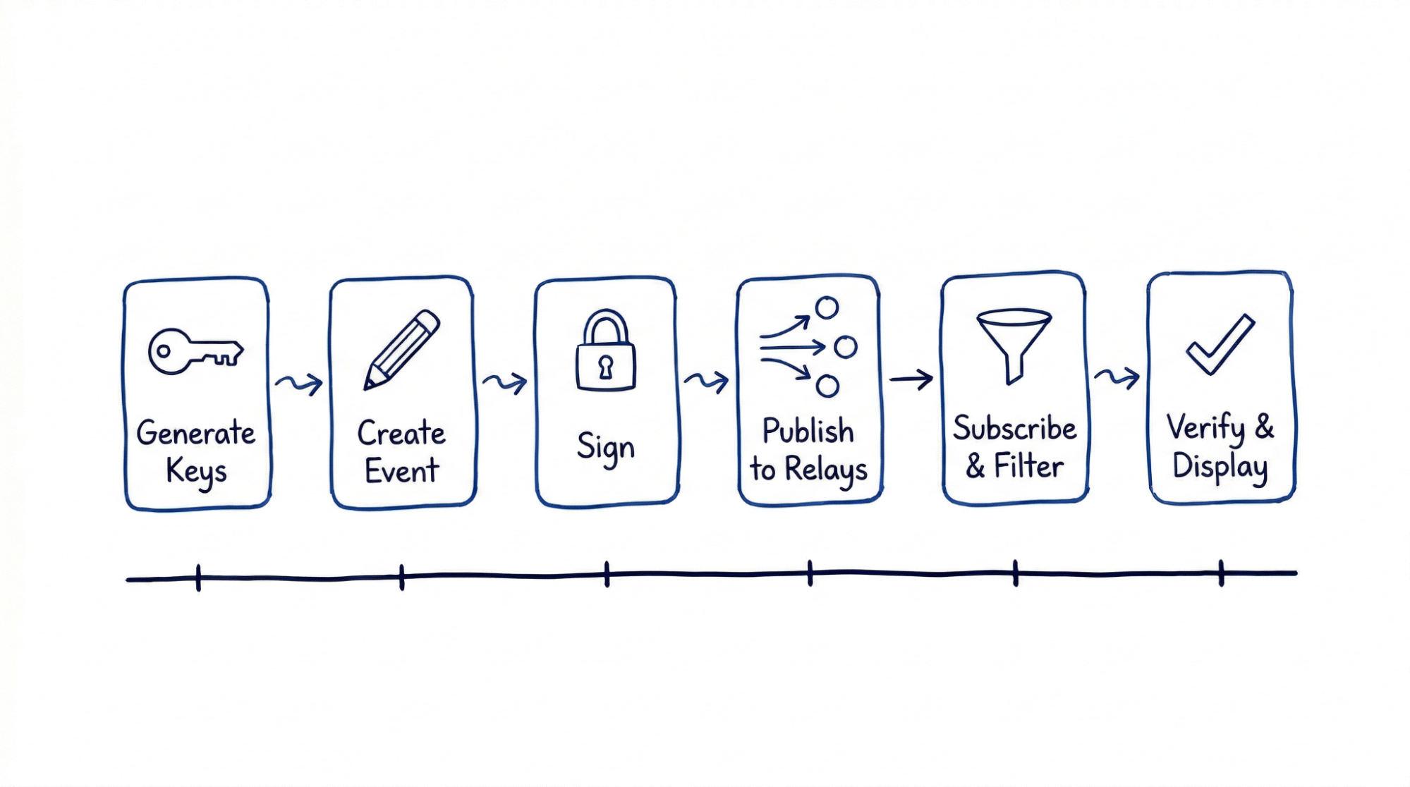 - Publish — send a signed event to the relay for storage and distribution